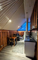 A queen-size double bed is perfectly placed under the windows, offering beautiful views of the sky. Designed for two, this cozy cabin provides a peaceful getaway
